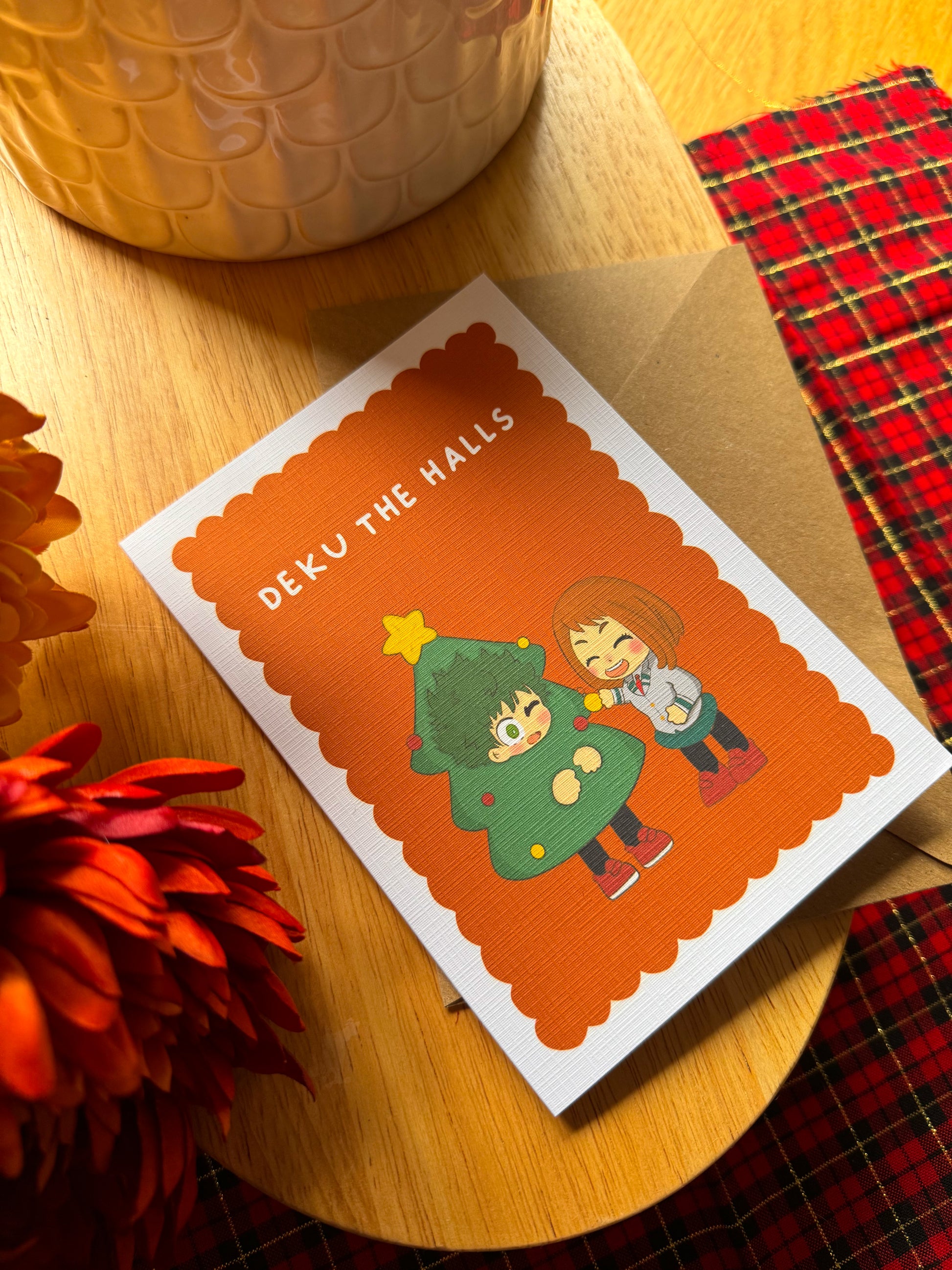 Bring some Plus Ultra festive cheer to the holidays with this adorable Christmas card featuring Deku dressed as a Christmas tree and Ochaco ready to celebrate! Perfect for MHA fans who deserve a wholesome (and slightly chaotic) Christmas greeting.