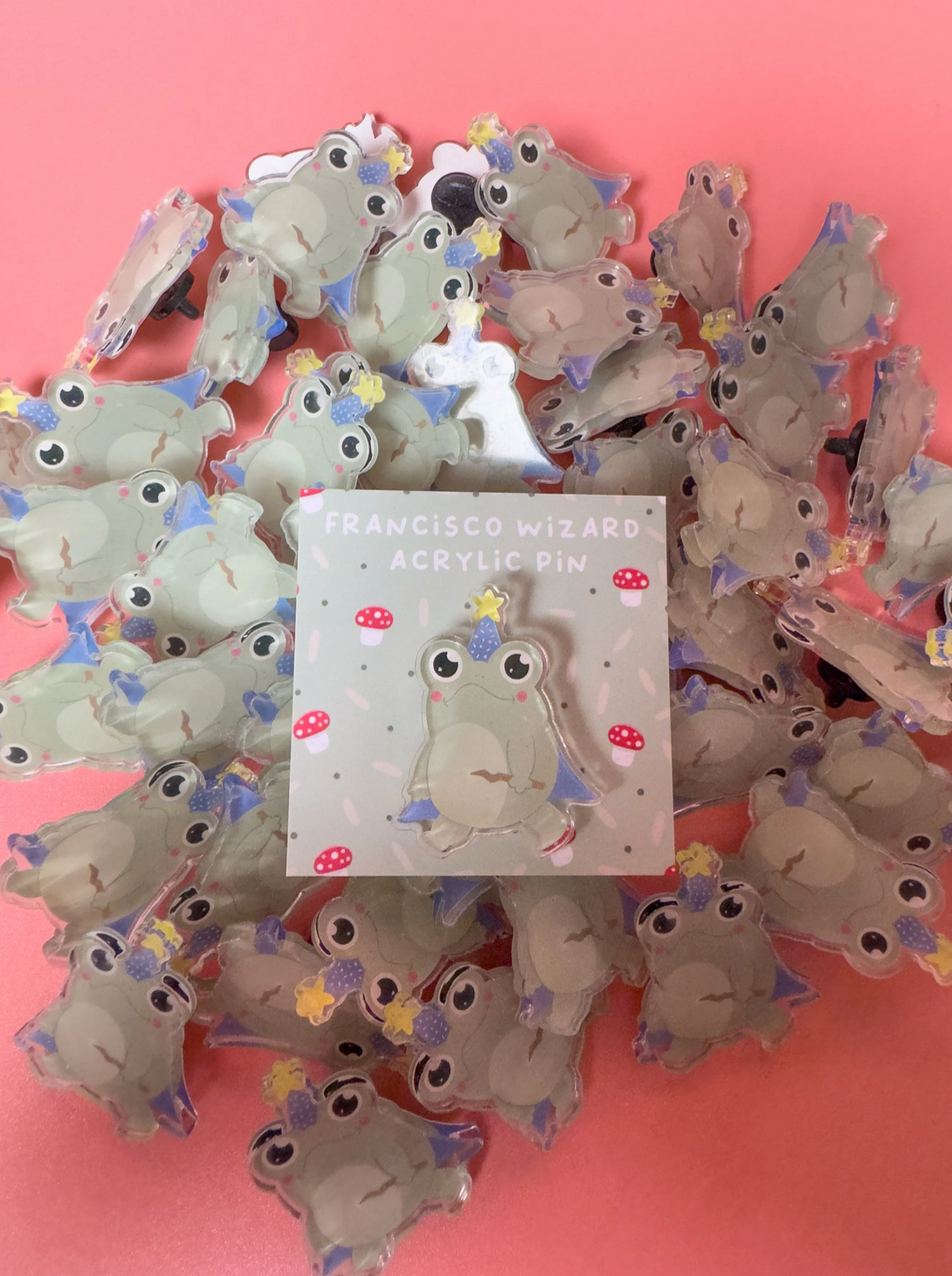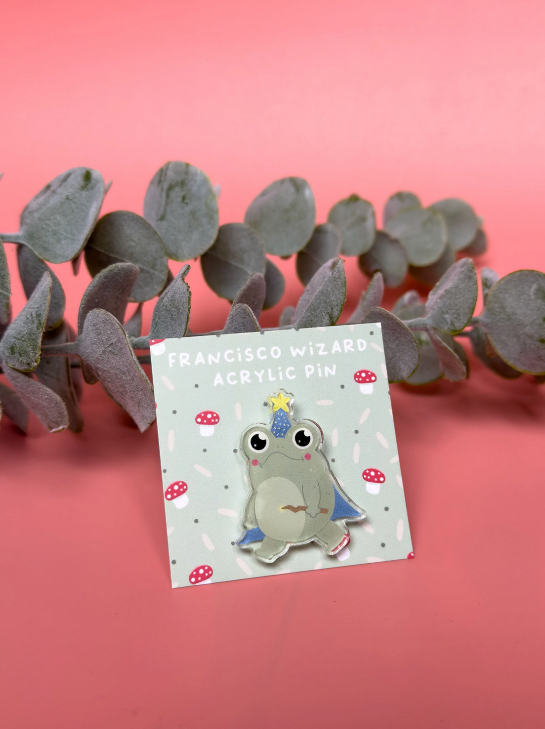 Add a sprinkle of whimsical magic to your pin collection with this charming "Francisco Frog" acrylic pin from Little Bu Studios.