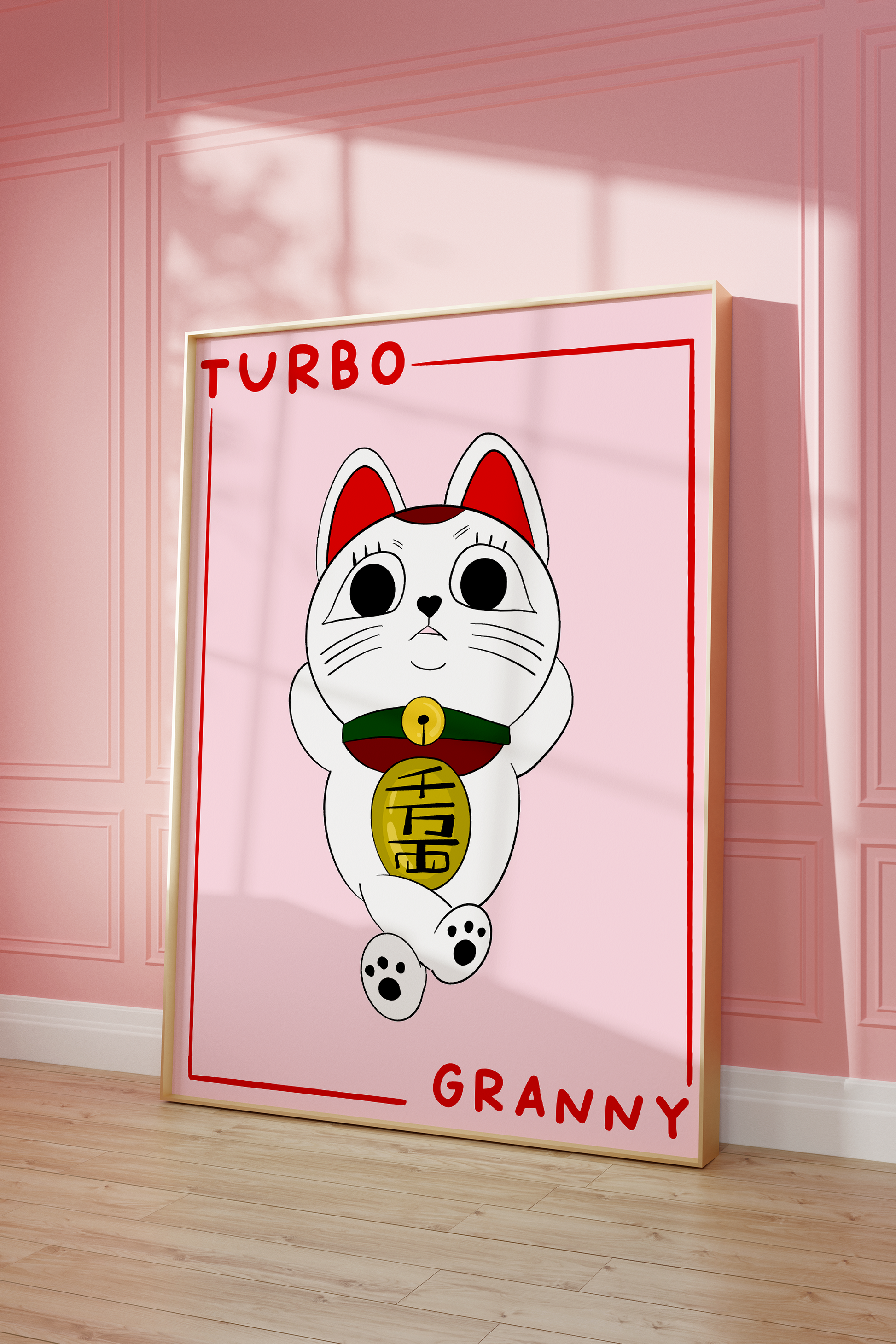 Add some anime charm to your space with this delightful "Turbo Granny" character art print from Little Bu Studios.