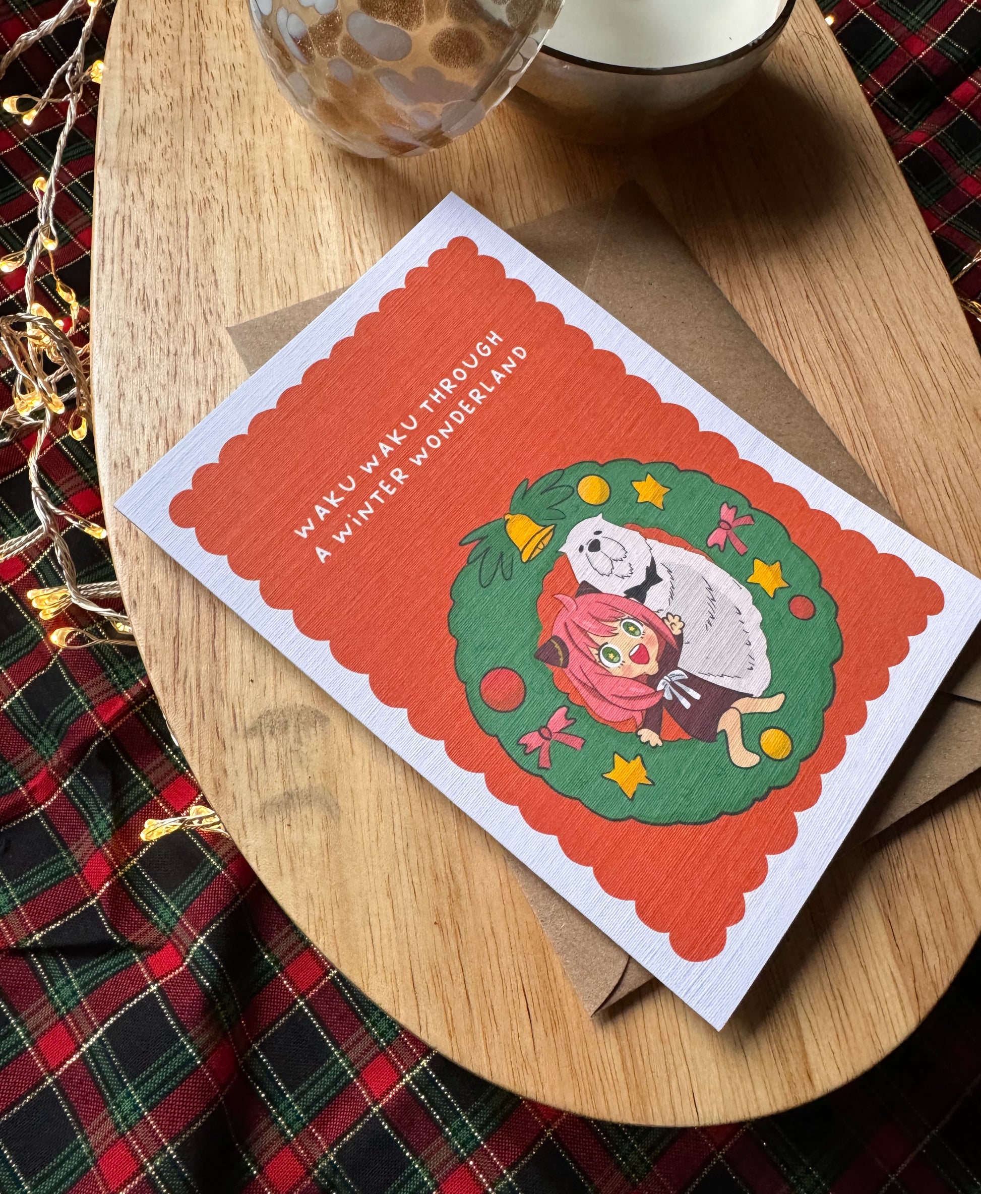 A festive anime Christmas card featuring Anya Forger and Bond inside a Christmas wreath – perfect for Spy x Family fans who want a cute, funny and waku waku holiday card.